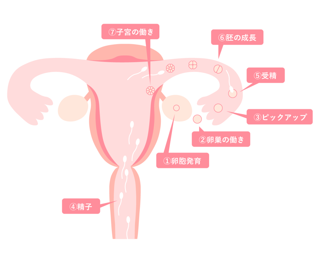 性行為で射精された精子が、卵子と出会うために子宮頸管、子宮、卵管へと進み、1 つの卵子と1つの精子が結びつき「受精卵」となります。