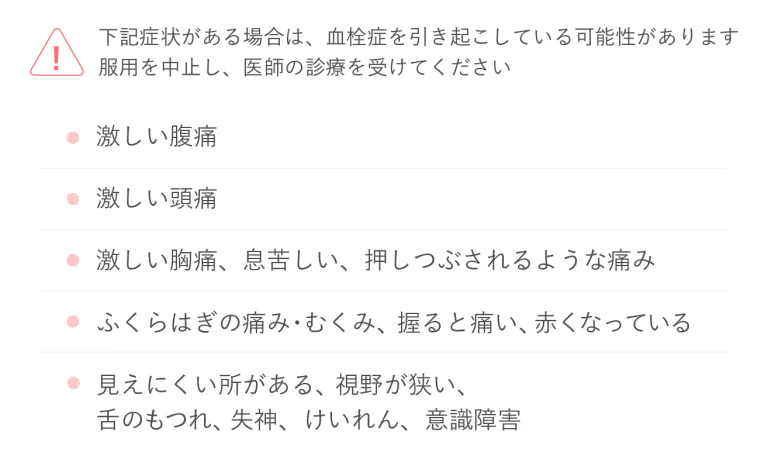 ピルの服用による血栓症の発生率はすごく高いわけではありませんが、不安な症状が出た場合は、必ず医師に相談してください。