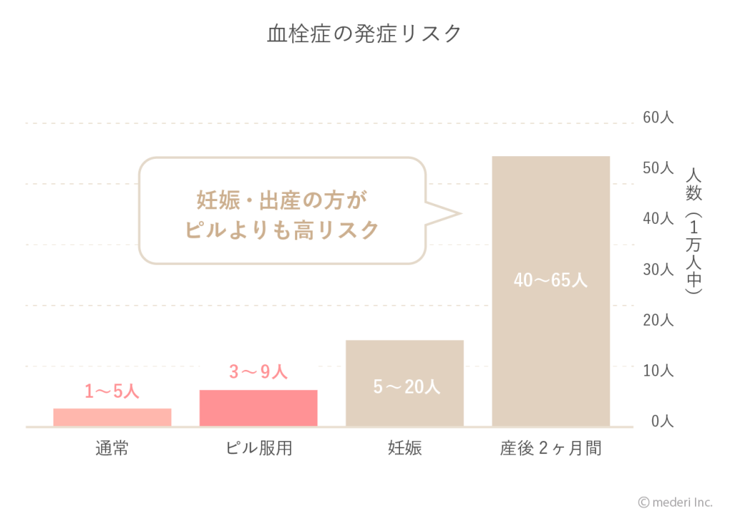 ちなみに、妊娠出産時はピルの服用よりも血栓症のリスクが上がることが分かっています。