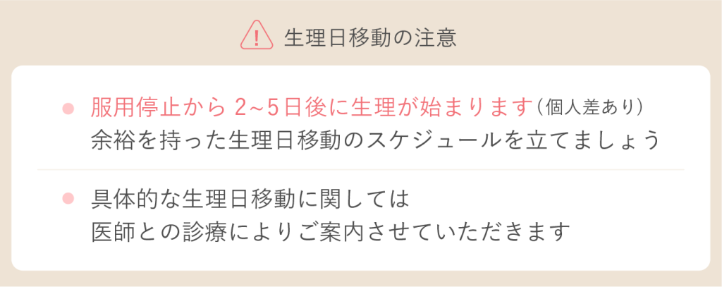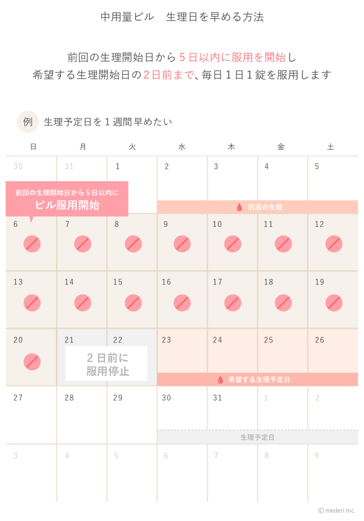 生理日を早めたい場合は、前月の生理開始日から5日以内に服用開始し、希望する生理開始日の2日前まで、毎日同じ時間に1錠ずつ服用ください。