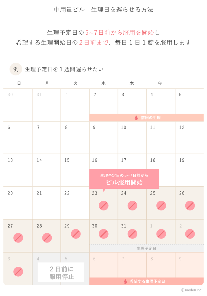 生理日を遅らせる場合は生理予定日の5〜7日前から服用を開始、希望する生理開始日の2日前まで毎日同じ時間に1錠ずつ服用し続けます。