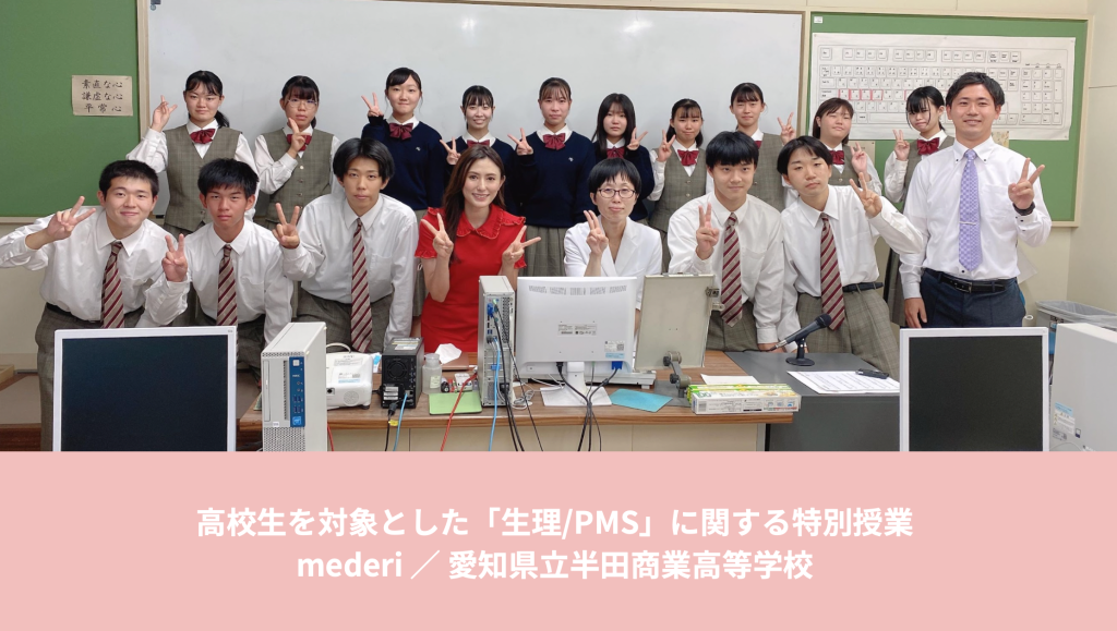 mederiでは「女性の生きやすさ」の実現を目指し、さまざまな年代・性別の方々へ、女性の身体について正しい知識を共有するセミナーを実施しています。今回は、愛知県立半田商業高等学校の課題研究生徒(男女15名)を対象に、2022年10月17日(月)に実施した「生理/PMSに関する特別授業」についてレポートします。