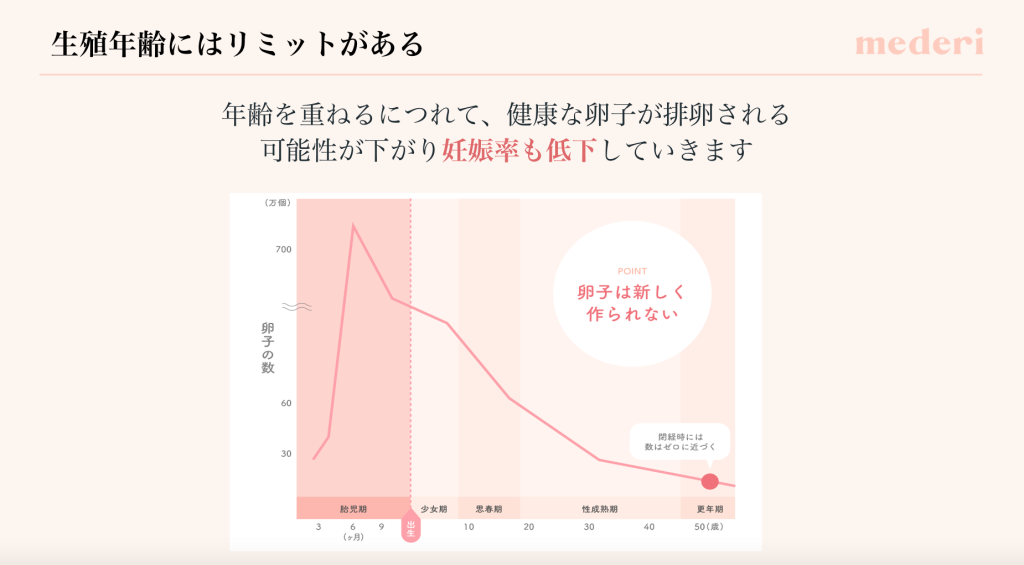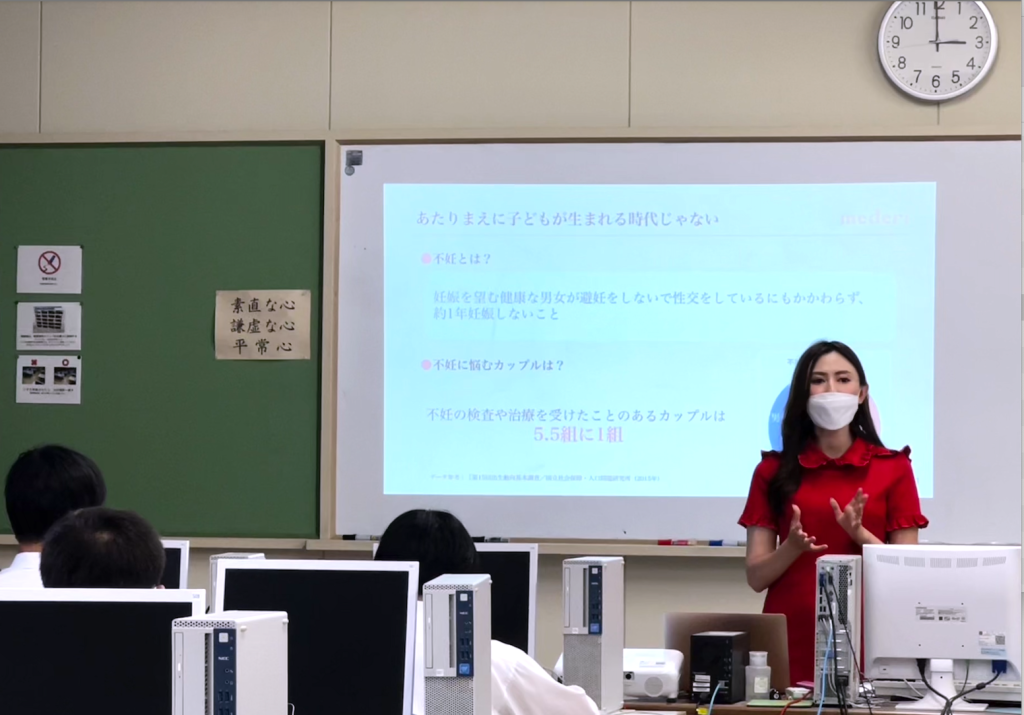 また最後に、mederi代表の坂梨からは自身の不妊治療にまつわる経験をもとに、ご自身の身体を知りライフプランを描く大切さをお話ししました。将来子どもを授かることを希望する・しないに関わらず、早めに知っておきたい出産年齢。まだ出産について考えるには早い年代の生徒たちですが、具体的な数値を早めに知っていただくことで、後悔のないライフプランを描くきっかけになればと思います。