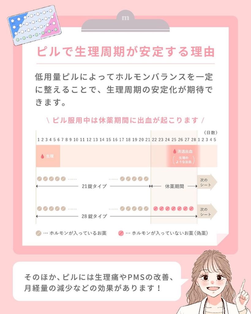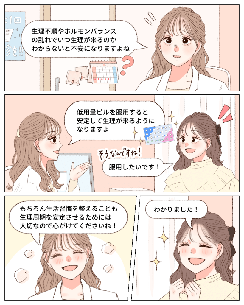 低用量ピルはホルモンバランスを一定に整える効果があるため生理周期の安定も期待できます。また排卵を抑制するため生理周期の安定以外にも様々な悩みを改善します。