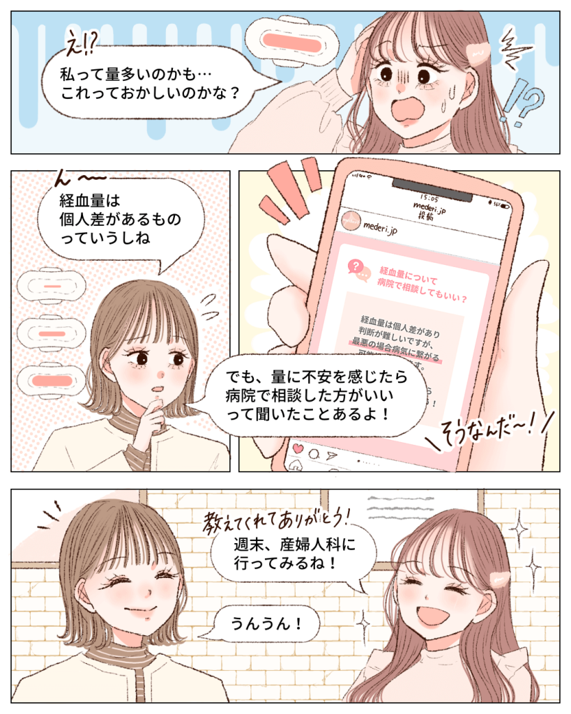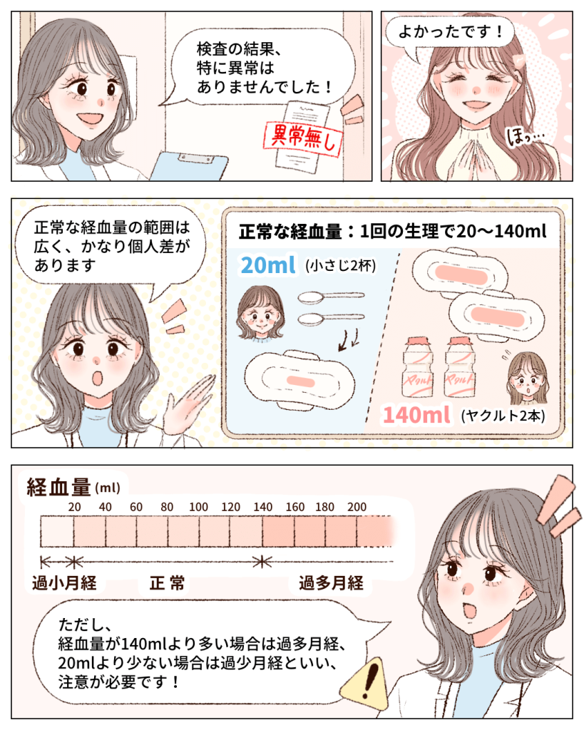 正常な経血量は1回の生理で20〜140mlといわれていて、実際はかなり個人差があります。少しでも自分の経血量に不安を感じたときは産婦人科を受診することをおすすめします!