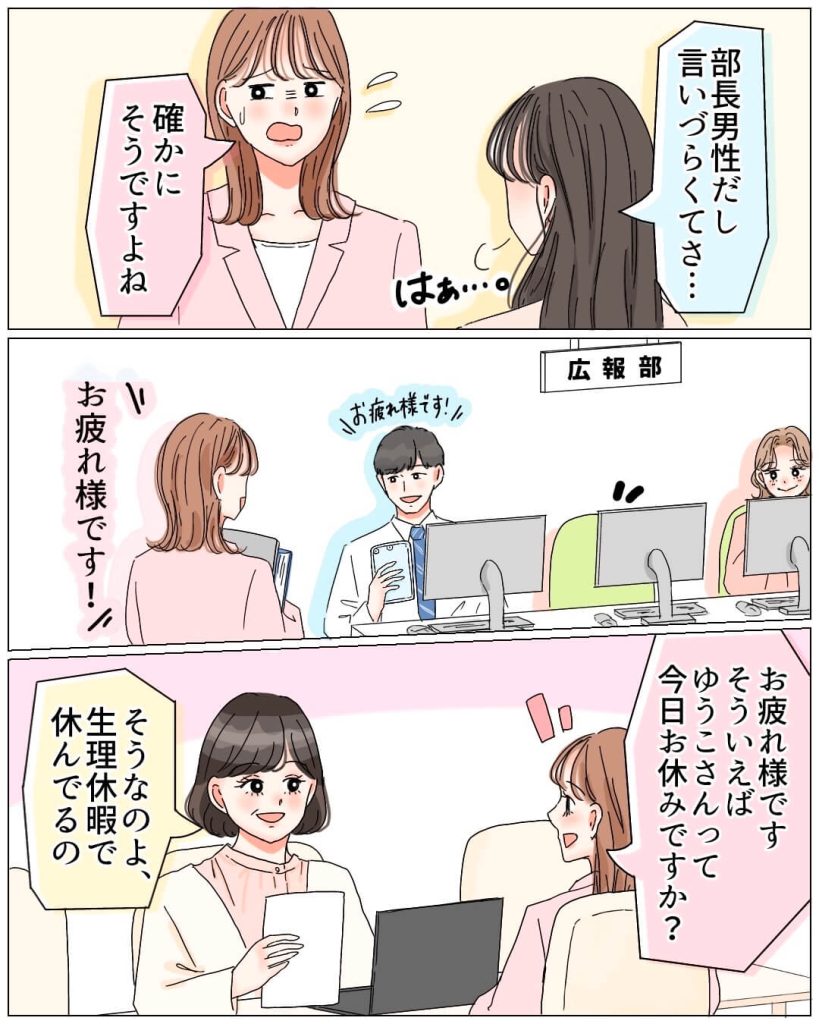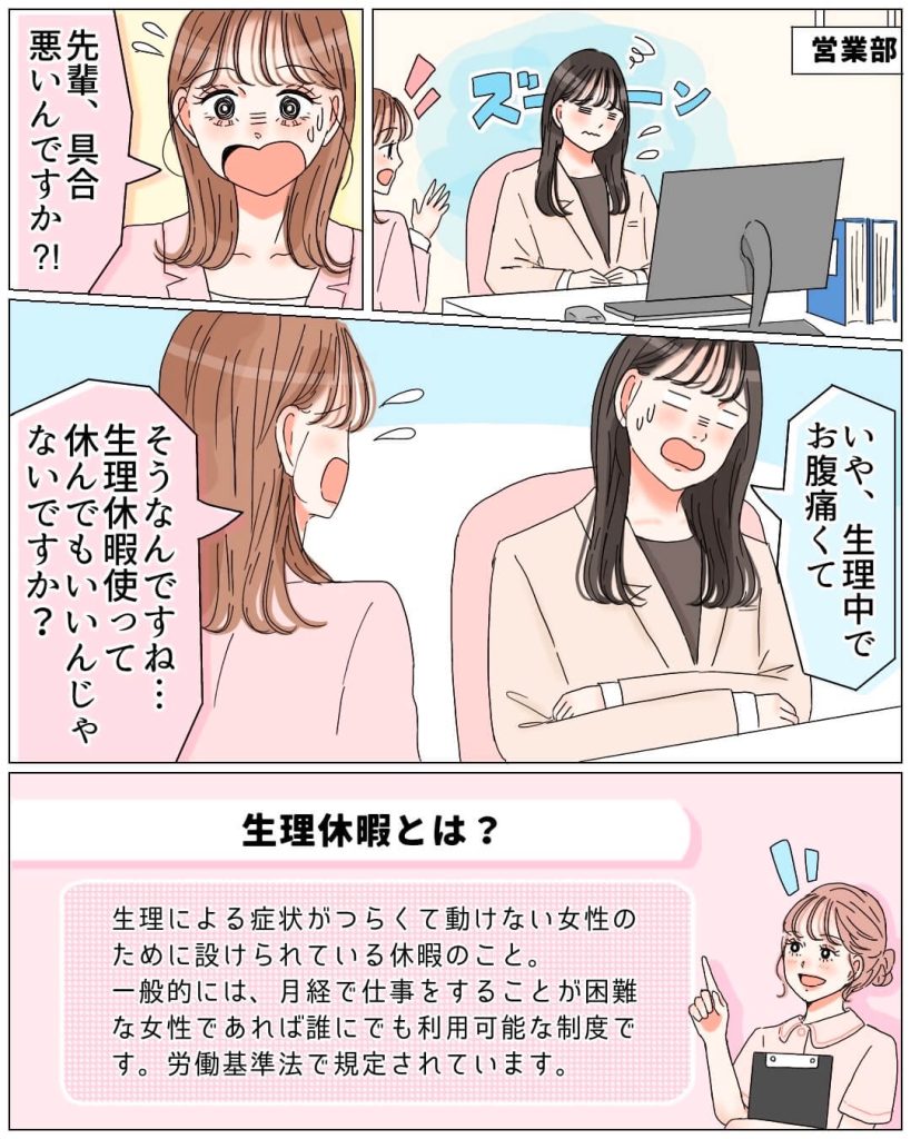 生理日や生理の重さは当日にしか分からないので、休暇の事前申請は必要ありません!また、医師の診断書も必要ありません。