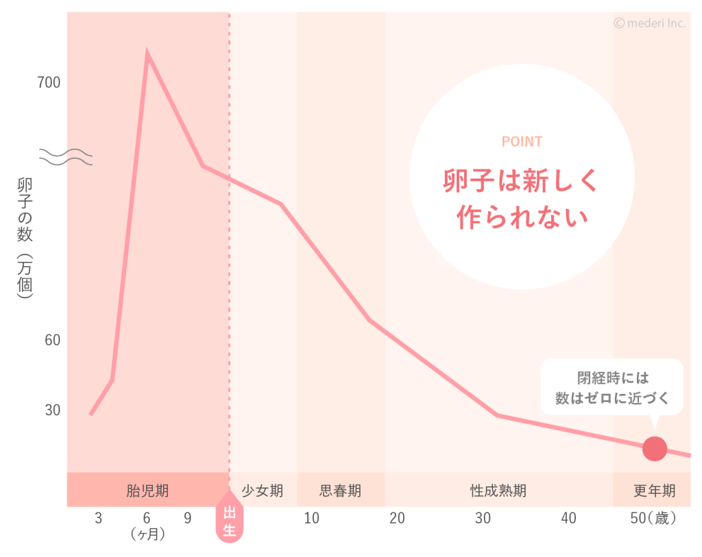 卵子は出生後新たに作られることはなく、全ての卵子はお母さんのお腹の中にいるときに作られます。卵子の数は妊娠20週頃が最も多く、初潮をむかえると1回の月経周期で数百〜千個が減少するといわれています。年齢とともに卵子は自然と減少し、生理が終わる閉経時には0に近づいていきます。