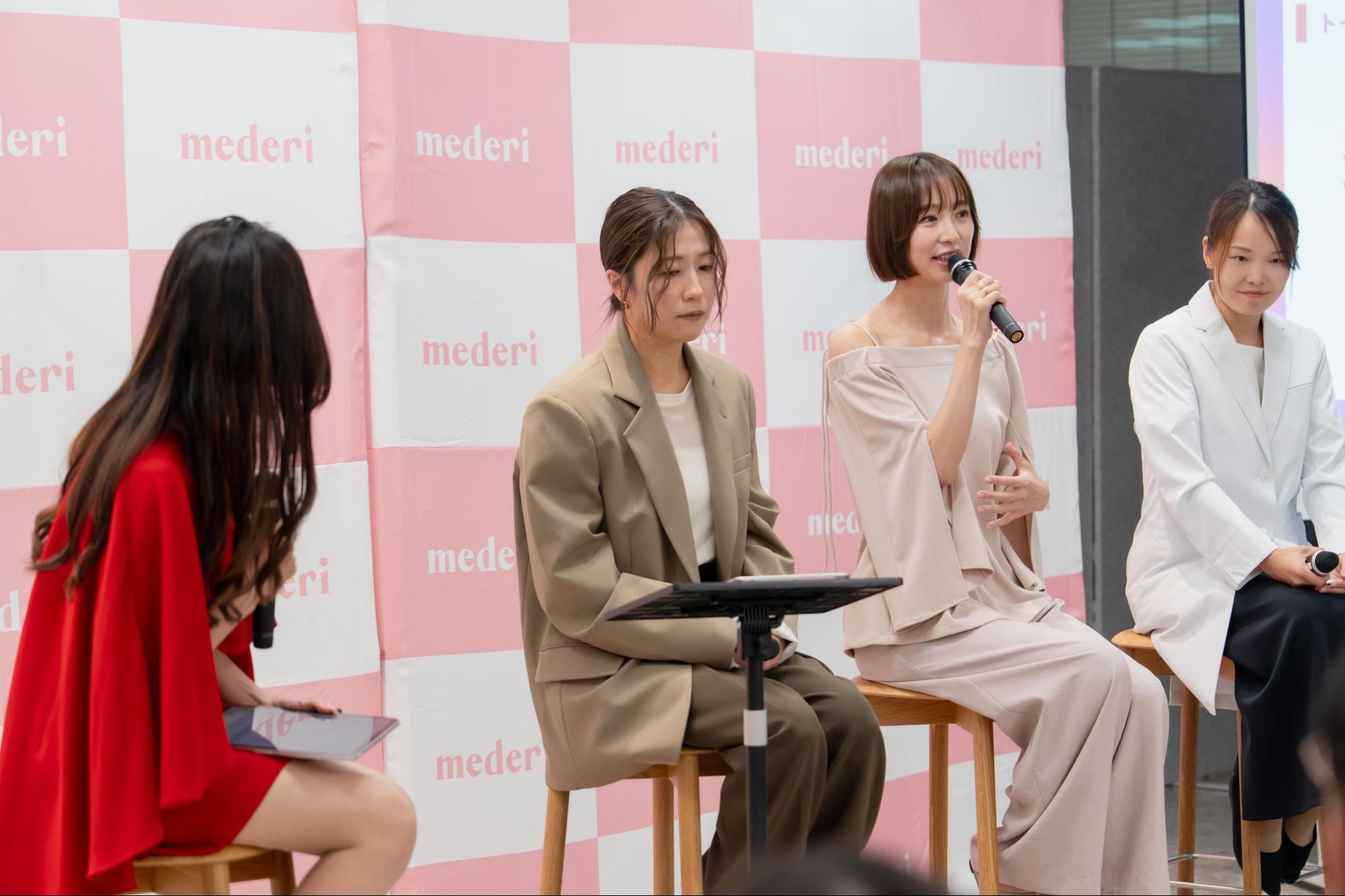 登壇:俳優・タレント 篠田麻里子さん、株式会社パン・パシフィック・インターナショナルホールディングス 取締役 兼 執行役員 二宮 仁美 氏、産婦人科医 郡詩織先生、mederi株式会社 代表取締役 坂梨 亜里咲