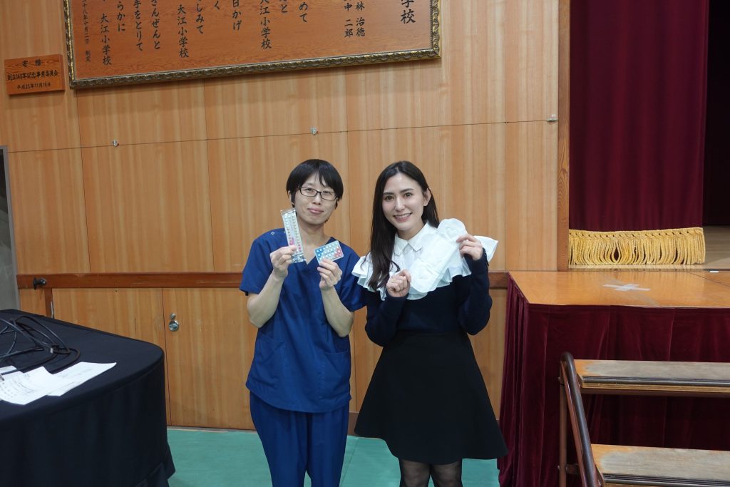 <全国の小中学校向け性教育の出張授業『mederi for school』での様子。左:産婦人科医 柴田綾子先生、右:mederi株式会社 代表取締役 坂梨亜里咲>