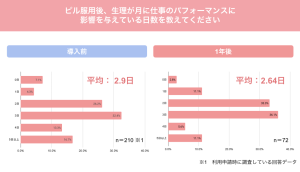 また同時に、生理が影響を与える仕事のパフォーマンス日数は導入前※8の平均2.90日から、制度利用後は平均2.64日へと減少。ピル服用により生理影響日数が減っていることが明らかとなりました。