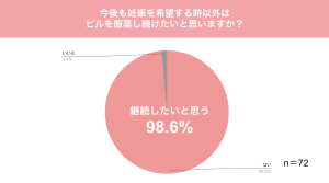 服用継続意向については98.6%の女性従業員がピル服用を続けたいという結果となり、その理由としては「月経痛の軽減」「生理不順の改善」「PMSの軽減」が全体の77%を占めました。