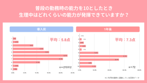 生理中の能力(10点満点)についても導入前※7の平均5.8点に対して、制度利用後は平均7.3点と1.6点増加。mederi for biz導入によるピル服用が、女性従業員の生理時のパフォーマンス向上に影響を与えていることが読み取れます。