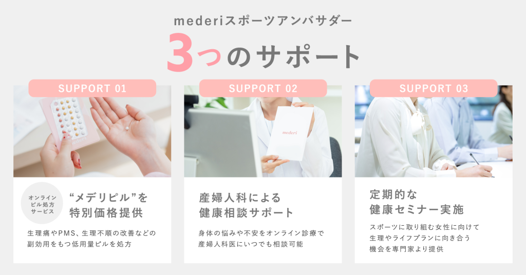 mederiでは、女性の生理/PMSに関する悩みを多くの方に知っていただくとともに、環境に左右されずに安心してスポーツに取り組むことのできる機会の提供を目指しています。今後も、スポーツに打ち込む女性アスリートたちの健康をサポートし、ますますの活躍を応援してまいります。