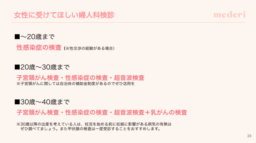 また、下記のような定期的な婦人科健診を通して、ご自身の身体の状態を知る機会を作ることで、女性たちがご自身の身体と長く上手に付き合っていけることを願っています。