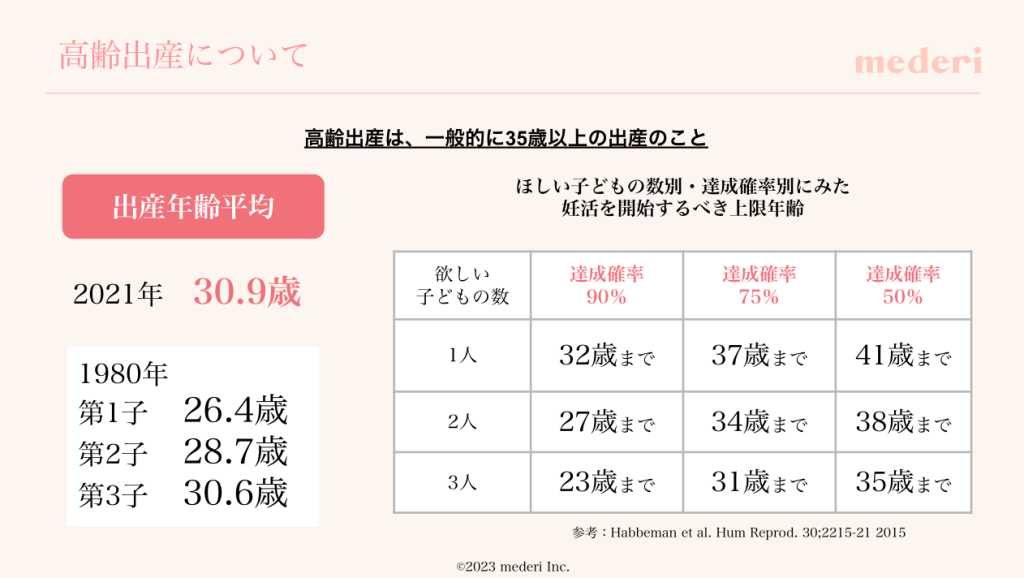 また、働く女性に知って頂きたいことの一つである「高齢出産と出産年齢」についても、具体的な数字をお伝えしました。授かりたい子どもの人数と年齢に応じて、一般的な達成確率は変化します。あくまでも参考数値ですが、下記のようなデータがあることも頭に入れた上で、ご自身の出産年齢について計画してみるのも良いかもしれません。