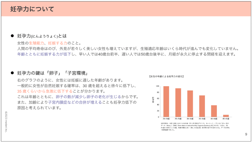第一部では、mederi代表取締役 坂梨の「キャリア」と、妊活・不妊治療で実感した「現代女性が後悔のない人生を歩むために必要な知識と行動」についてお話しさせていただきました。多くの女性にとって自身のライフプランについて考えるきっかけにもなる30歳。キャリアアップ、結婚、妊娠出産…さまざまな選択肢に向き合います。
