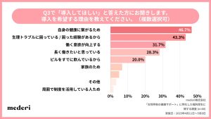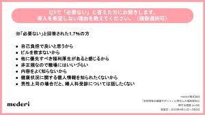 また、導入不要の理由として、「自己負担で十分」「ピルを使用していない」といった実用面に加え、「健康状態を開示したくない」「男性上司への配慮」など心理的な理由も一部に見られた