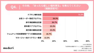 「ナプキン無料支給」が最多となった。次いで「女性リーダー育成プログラム」など、キャリア支援も期待されている。