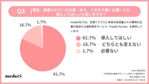 当社が提供する、生理トラブルに有用な低用量ピルの費用を企業が負担する福利厚生サービス『mederi for biz』についての導入希望を聞いてみたところ、回答者のうち、80%以上の女性が導入を希望されました。生理による体調不良や業務への支障を軽減したいと考える女性が多く、低用量ピルの福利厚生によって安心して働ける環境を求める声が高まっているようです。