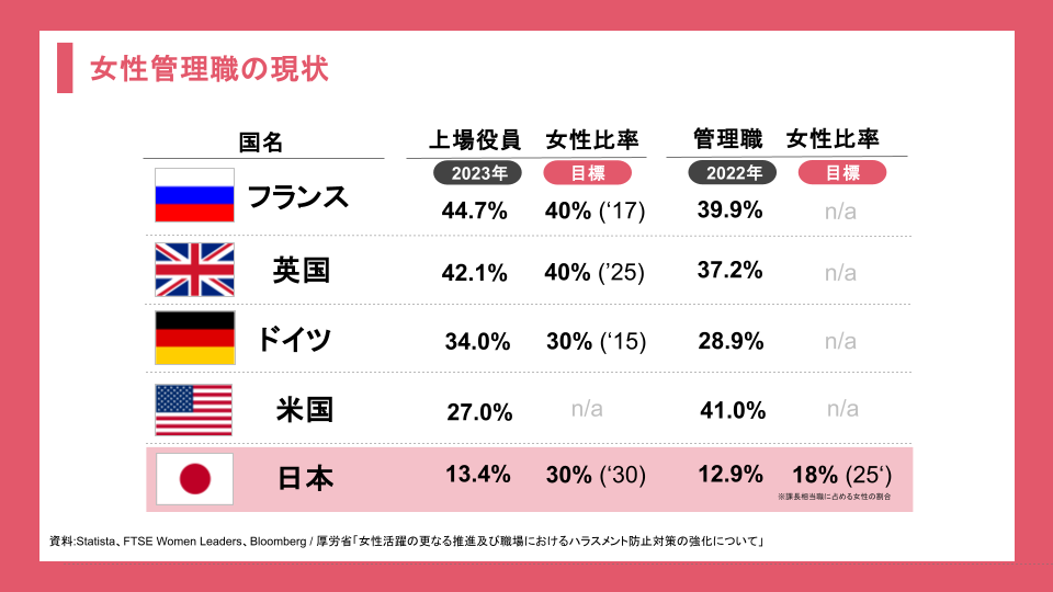 日本の上場企業役員の女性比率は13.4%、管理職の女性比率は13.2%と、他の主要国と比べて大幅に低い状況です。また、日本政府は2030年までに女性役員比率30%を目標に掲げていますが、現状では達成の目途が立っていません。