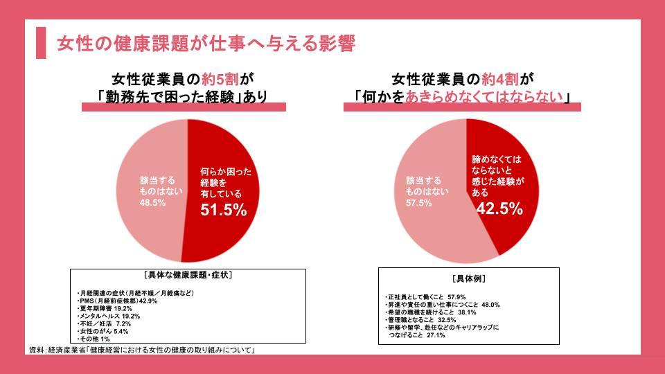 「健康課題が仕事に影響を与えた経験がある」と答えた女性が約50%にのぼるというデータもあり、特に20〜30代の「キャリア形成期」は、生理痛やPMSへの理解が進まないことなどが課題です。