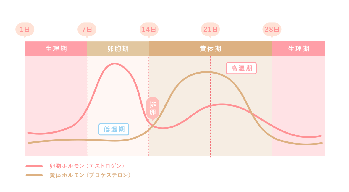 以下の図では、生理周期を4つの期間に分け、それぞれのホルモン分泌と体内での変化を視覚的に確認できます。