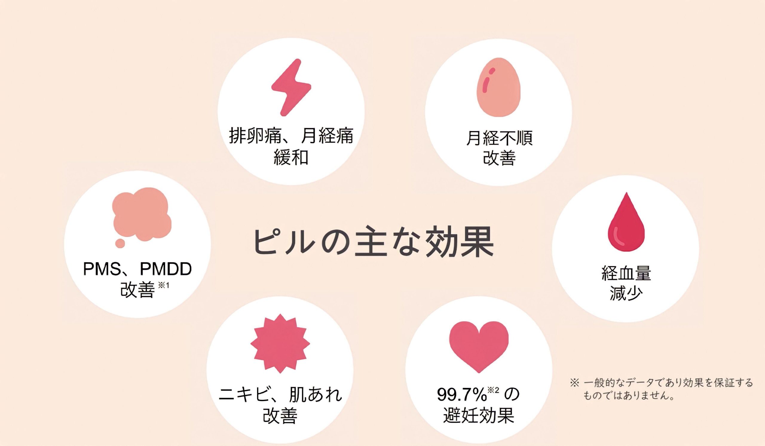 ピルの種類にもよりますが、低用量ピルは避妊効果だけでなく、副効用として生理痛・PMS(月経前症候群)の症状の緩和、生理周期の安定化、肌荒れの改善なども期待できます。また、子宮体がんや卵巣がんを予防する効果もあります。