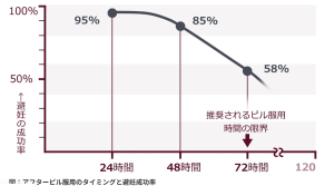アフターピルは、時間が経つほど避妊の効果が少しずつ下がってしまうので、性交渉後できるだけ早く服用することが大切です。避妊効果を最大限にするには性交後72時間以内、できれば24時間以内が理想です。