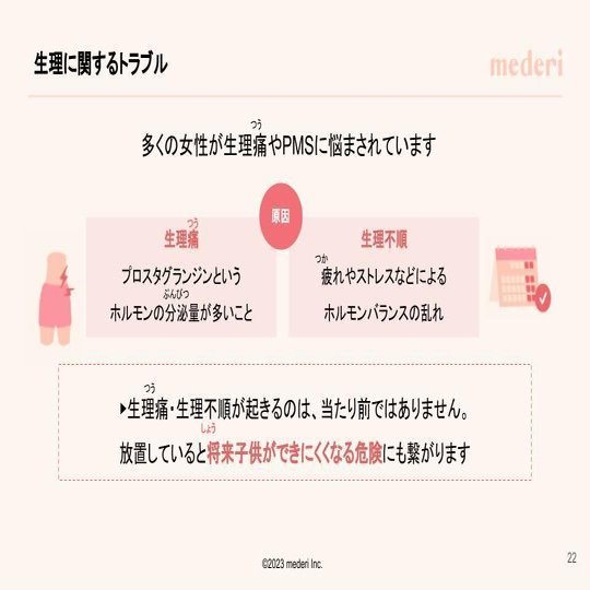 mederiでは、今後も様々な年代の男女へ向けて、生理/PMSに対する正しい理解や、ご自身の身体に合わせた選択肢の提供を目指して、女性の健康課題や性教育に関するセミナー活動を実施していく予定です。またオンラインピル診療サービス「mederi Pill」をはじめ、展開する様々なサービスを通して「女性の生きやすさ」の実現を目指してまいります。