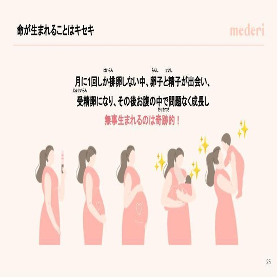その後、生理は妊娠のために起こるものということを説明し、妊娠の仕組みと共に「妊娠して無事に命が誕生してくることは奇跡的なもの」ということをお伝えしました。