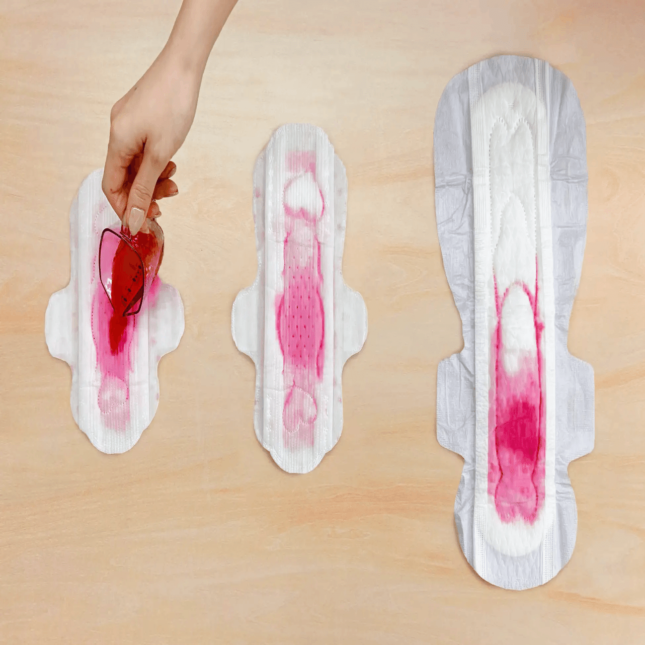 <左より、普通の日用、多い日用・特に多い日用のナプキン>
