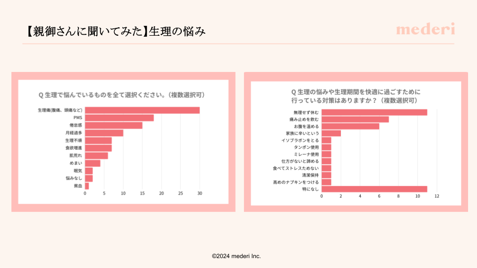 mederiでは、今後も様々な年代の男女へ向けて、生理/PMSに対する正しい理解や、ご自身の身体に合わせた選択肢の提供を目指して、女性の健康課題や性教育に関するセミナー活動を実施していく予定です。またオンラインピル診療サービス「mederi Pill」をはじめ、展開する様々なサービスを通して「女性の生きやすさ」の実現を目指してまいります。