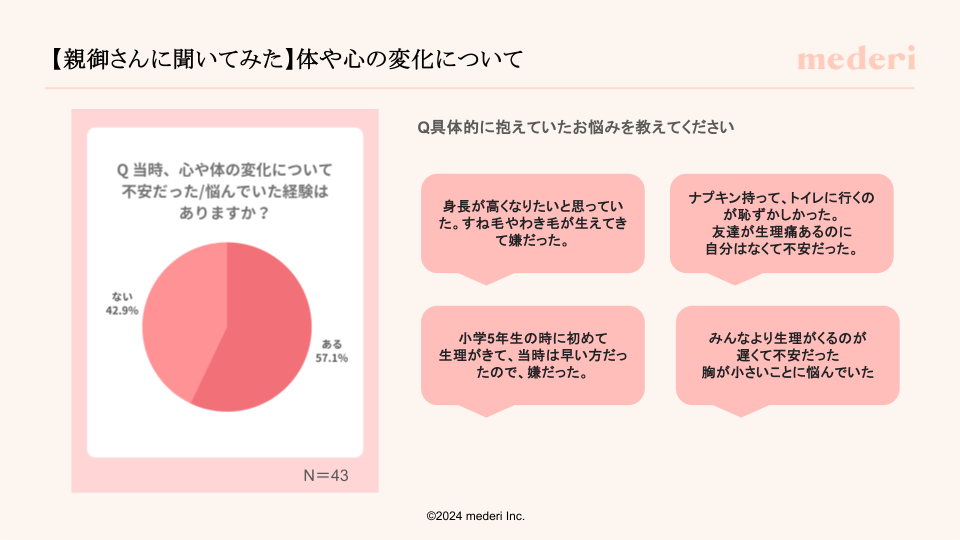 相模女子大学中学部では、昨年6月にもmederi出張授業を開催しており、今回は2回目の開催となりました。「中学生は心身の変化に戸惑いを感じる時期であり、その過程で自分の体を理解することは心の支えになるため専門家を招聘して性教育を実施したい」という担当教諭の想いのもと、今回新たに、保護者を対象に自分自身が成長期だったころの悩みや生理についての事前アンケートを実施。その内容を授業内で生徒向けにmederiドクターの解説を交えながら紹介しました。