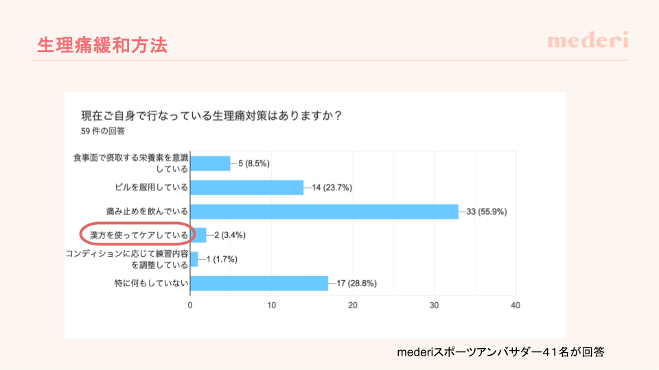 次に、『生理痛緩和方法を教えて欲しいです』という相談については、一般的な痛み止めのほかに、低用量ピルや漢方薬の使用を紹介しました。痛み止めの服用タイミングについては、痛くなる前もしくは試合など大切な時の1時間ほど前の服用が効果的であるとお伝えしました。低用量ピルについては、PMSや生理痛などのトラブルから解放されるだけでなく、子宮内膜症の予防にも効果的である点を説明。