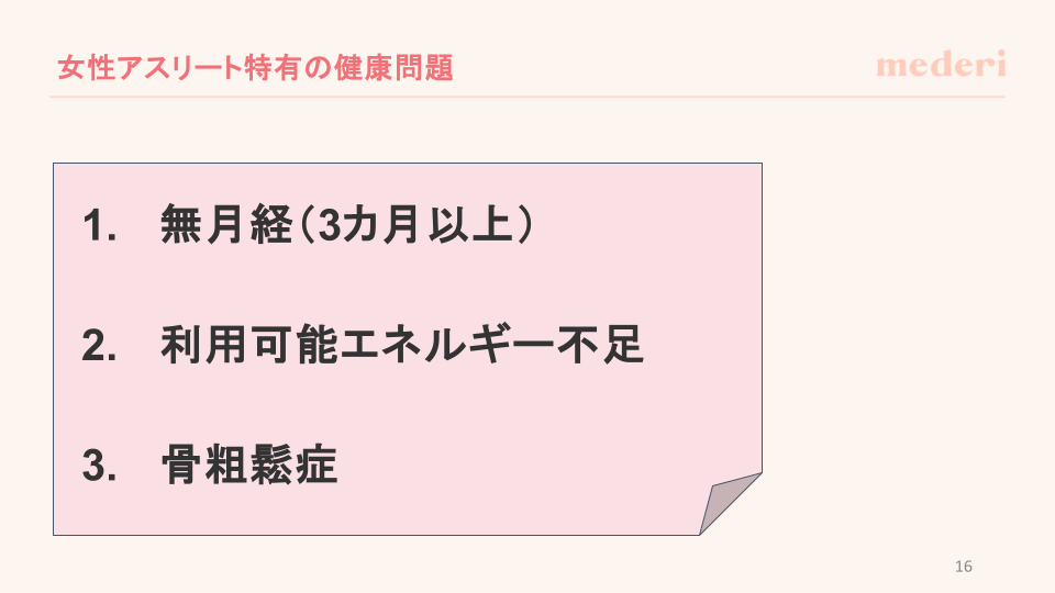 加えて、アスリート特有の健康問題として、無月経・利用可能エネルギー不足・骨粗鬆症とそのリスクを紹介。なかでも無月経には特に注意が必要であり、3カ月以上月経がない場合には医療機関への受診を推奨していることや、骨粗鬆症のリスクも高まるため適切な栄養補給と体重管理が重要になる点を説明しました。