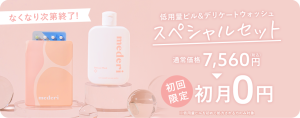 mederi Pillの「低用量ピル」の新規ご利用者様のみ限定で、デリケートウォッシュ現品をつけたスペシャルセットを、初回限定特別価格として【初月0円】にてご提供します。