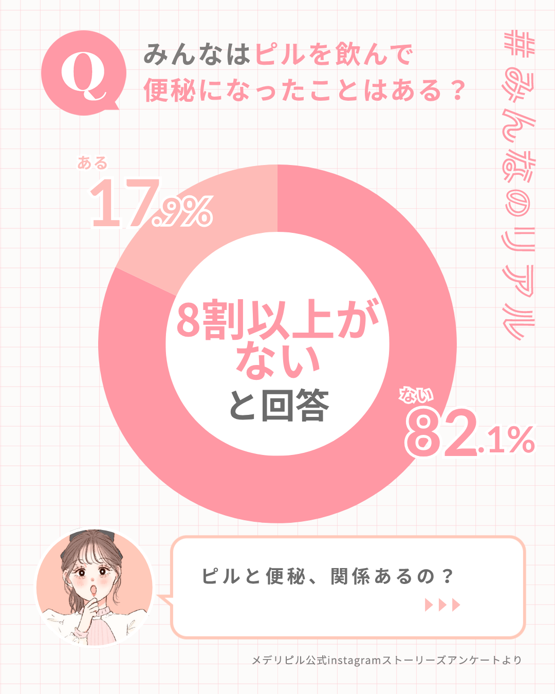 また、副作用として知られる「便秘」に関しては、「便秘になったことはない」と回答した方が約8割にのぼり、多くの方が日常生活に大きな支障を感じずにピルを服用できていることが明らかになりました。ただし、体質によっては便秘の症状を感じる方もいるため、水分や食物繊維の摂取、軽い運動といったセルフケアの知識を持っておくことが安心につながります。