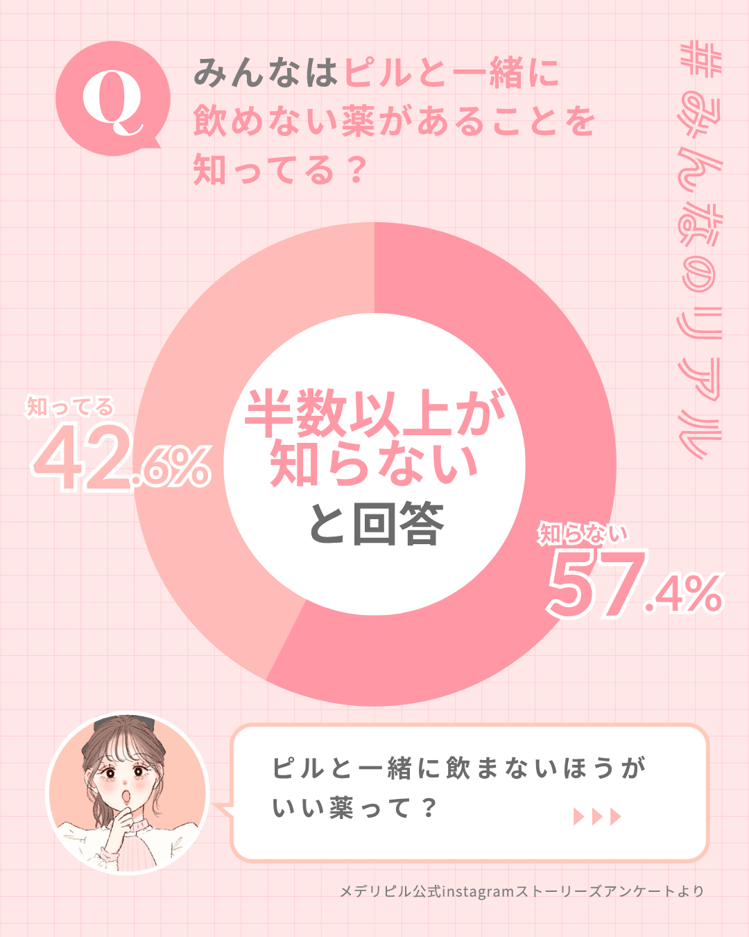 ピルと一緒に飲めない薬があることを知っているかの質問に対しては、その結果、「知っている」と答えた人は42.6%にとどまり、「知らない」と答えた人が57.4%と半数を超える回答となりました。