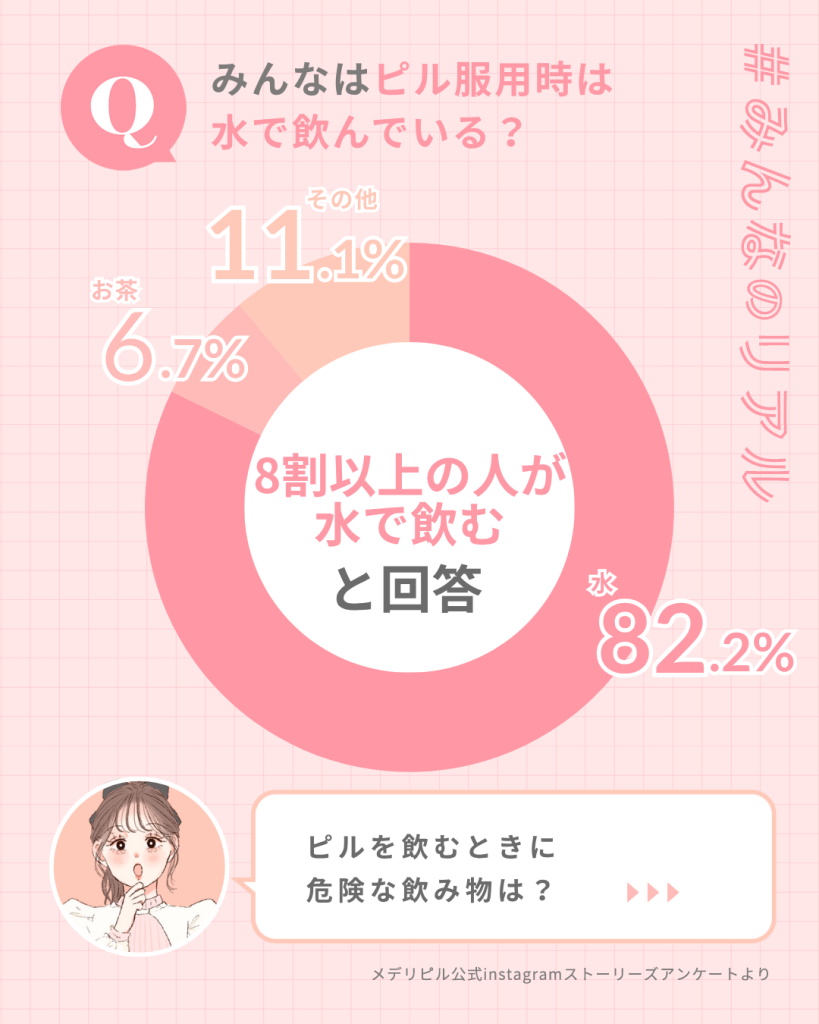今回の調査では、まず服用方法に関する意識として、「ピルを水で飲んでいる」と回答した方が82.2%と多数を占め、正しい飲み方を実践している方が多いことが分かりました。一方で、ジュースやお茶など水以外の飲み物で服用している方も一定数おられるため、副作用の影響を考慮すると、今後の啓発が求められる結果となりました。