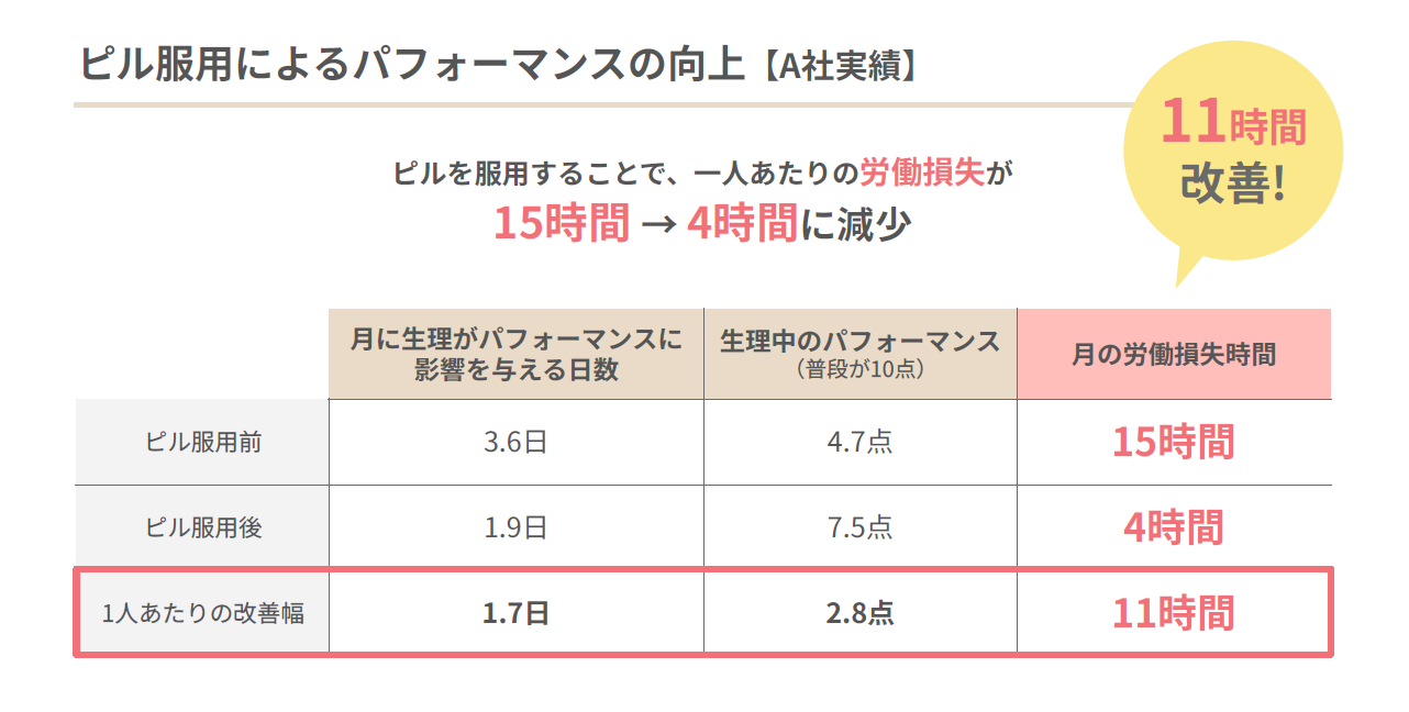 講演では、低用量ピルの服用によって生理痛やPMSの症状が軽減し、仕事のパフォーマンスが向上したという企業事例が共有されました。労働損失時間が約15時間から4時間へと大幅に減少したケースも紹介され、女性の健康課題が仕事に与える影響の大きさが改めて明らかになりました。