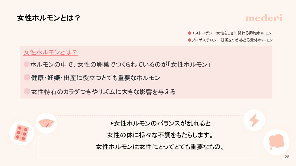 本セミナーでは、エストロゲンとプロゲステロンという2つの女性ホルモンの役割や、年齢による分泌量の変化、ホルモンバランスが乱れた際に起こりやすい不調について、図解を交えてわかりやすく解説しました。