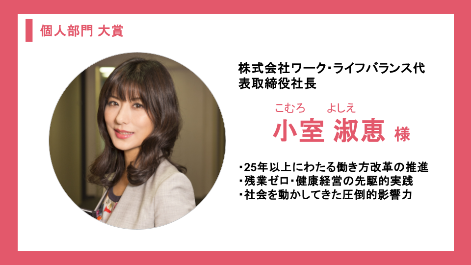 今年度の個人部門大賞は、小室淑恵氏(株式会社ワーク・ライフバランス 代表取締役 社長)が受賞しました。