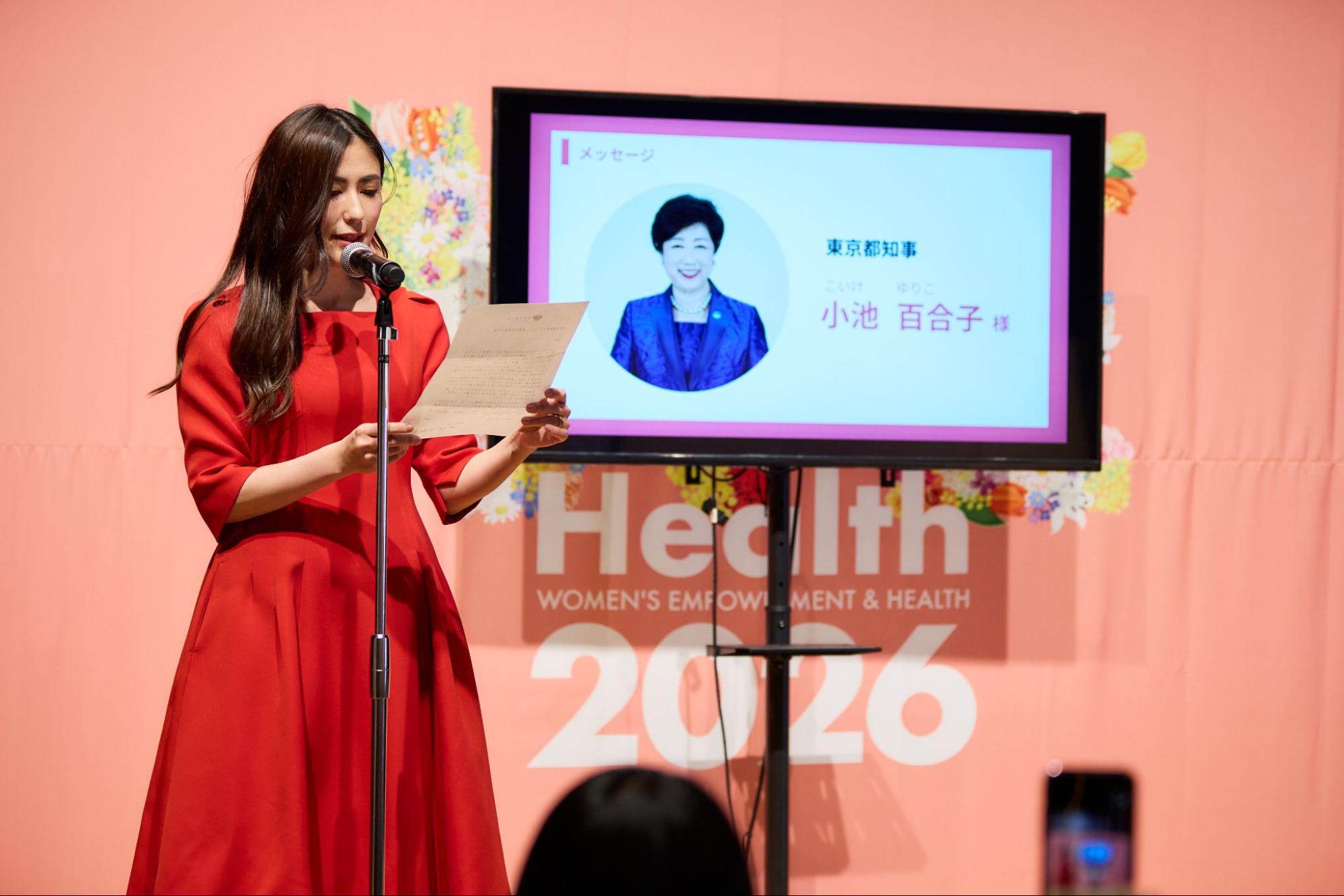 東京都知事 小池百合子氏から寄せられた応援メッセージが代読され、女性活躍の推進は持続可能な社会の実現に向けて重要なテーマであり、本アワードを通じて企業・行政・民間が連携して取り組みを進めていくことへの期待が述べられました。|