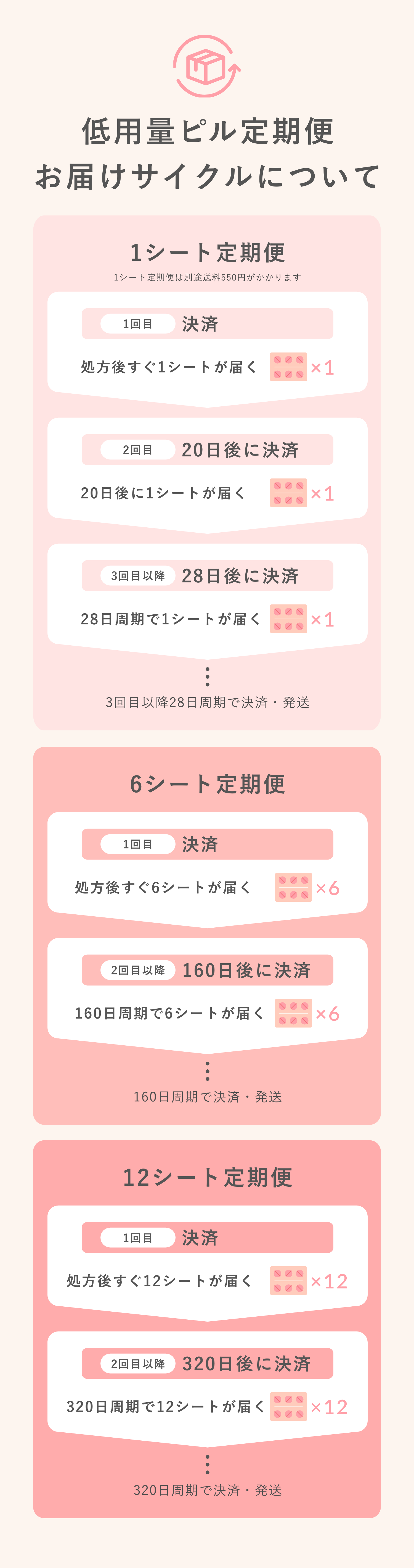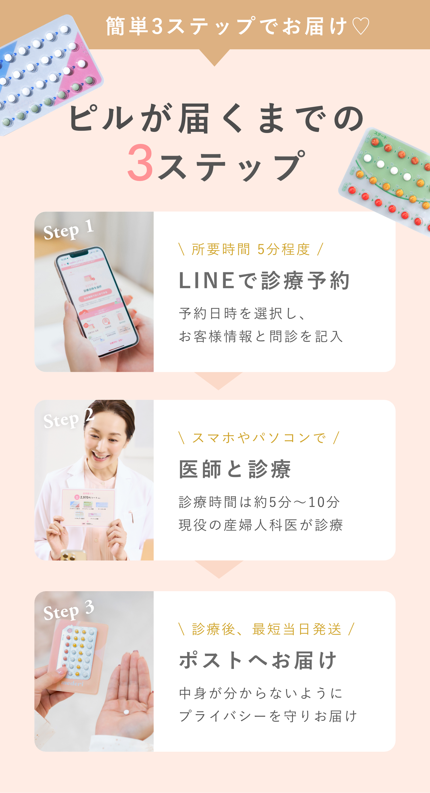 予約日時に医師とのオンラインでの診療を行い、ピルの処方が決まり次第、最短翌日でお手元にピルを届け、それ以降は配送プランに応じて定期配送いたします。