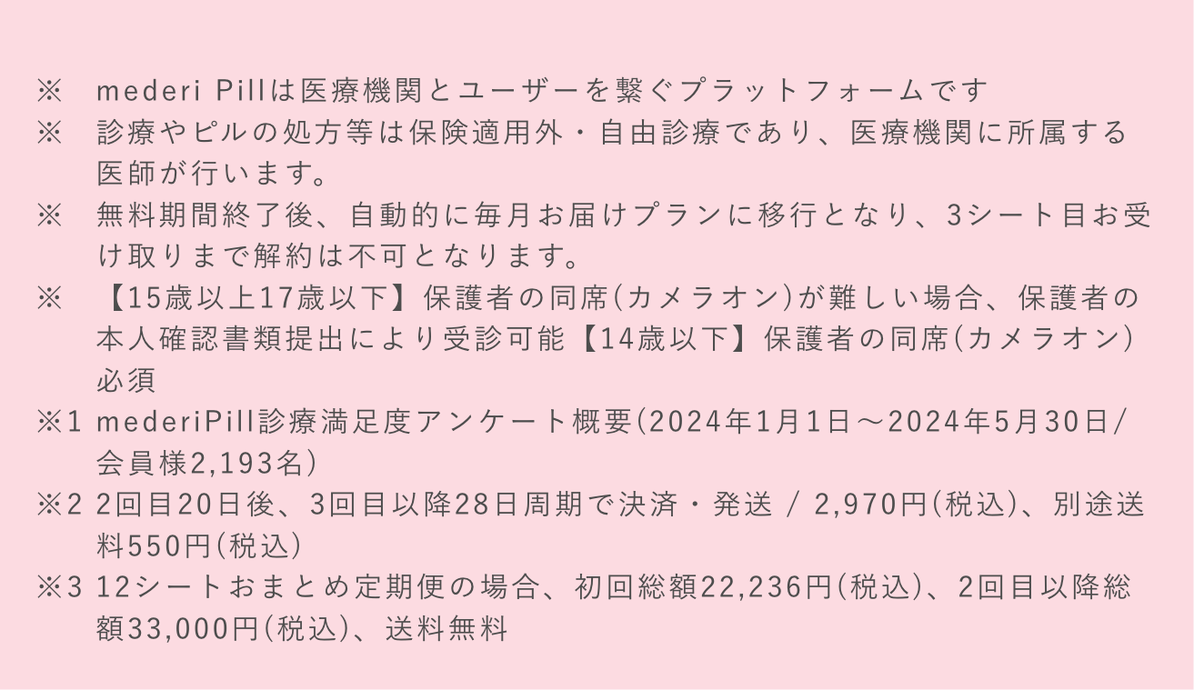 ピルの処方において医師との診療は必須なため、 mederi Pillのご利用がはじめての方には必ず受けていただきます。