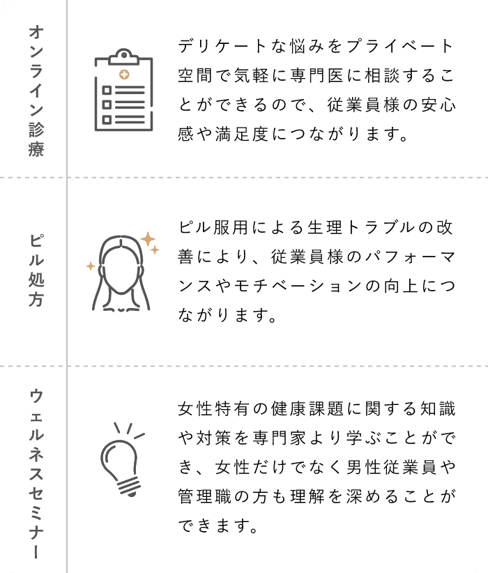 ピル服用による生理トラブルの改善により、従業員様のパフォーマンスやモチベーションの向上につながります。 |