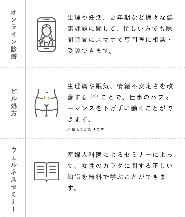 生理や妊活、更年期など様々な健康課題に関して、忙しい方でも隙間時間にスマホで専門医に相談・受診できます。 |