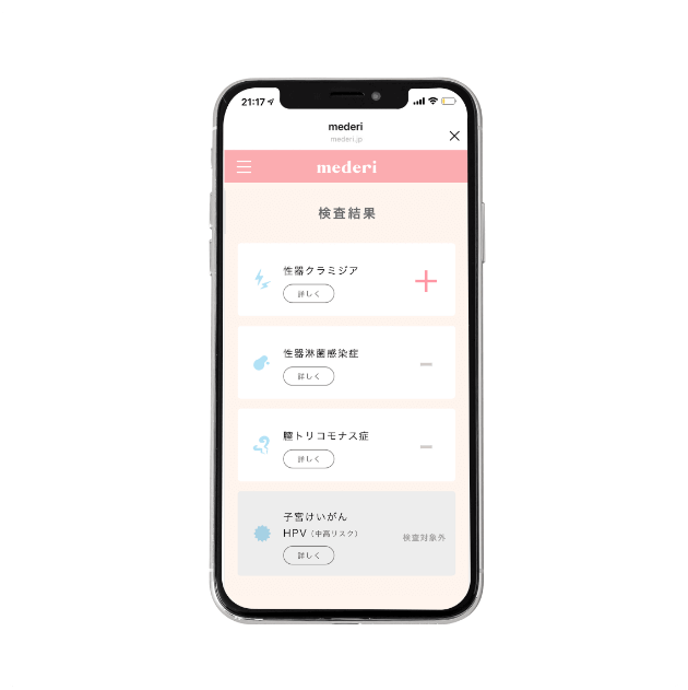 再感染しないように検査結果ともにアドバイスをお伝えしますので、ぜひご確認ください。- 検査項目によってはmederiドクターによるオンライン診療で抗菌剤などを処方することが可能です。